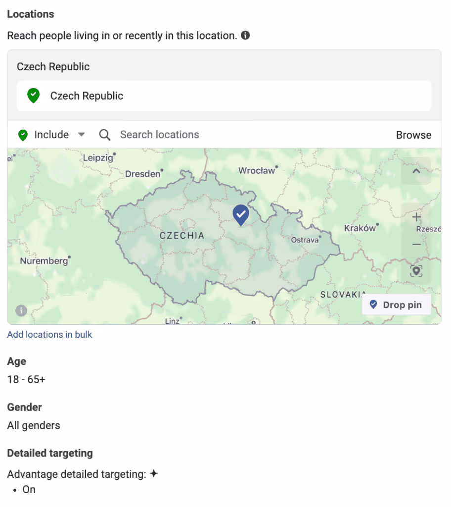 Specifikum DABY a Advantage+ je, že je cílíte na širokém publikum potenciálních zákazníků, nejčastěji na všechny uživatele Facebooku a Instagramu v rámci České republiky.