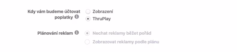 Facebook vám za každé zobrazení reklamy účtuje určitou částku. U některých účelů kampaní si pak můžete zvolit jiný model, kdy vám Facebook účtuje za kliknutí (CPC) na odkaz nebo za shlédnutí videa (ThruPlay).