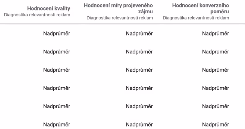 Vaším cílem je mít u všech reklam “Nadprůměr”, jako to vidíte na printscreenu ze správce reklam jednoho z našich klientů.