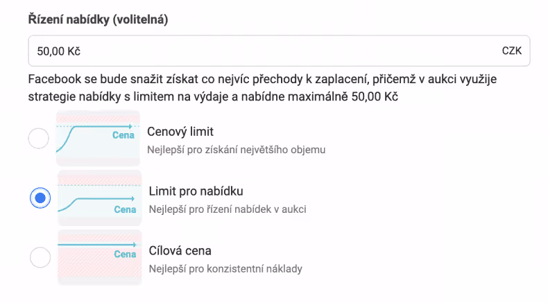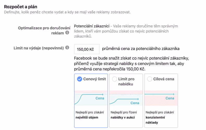 Ve výchozím nastavení kampaní se Facebook pokusí splnit vámi vytyčený cíl co nejlépe a za co nejnižší cenu.