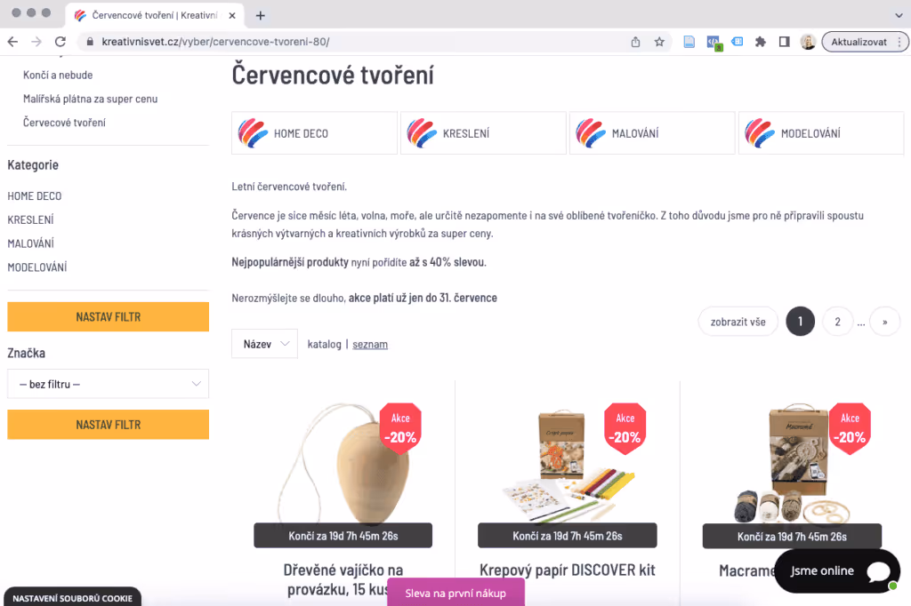 Inspirovat se můžete třeba naším klientem Kreativnisvet.cz, který udělal skupinu produktů pro letní červencové tvoření a všechny produkty v této skupině zlevnil o 20 %.