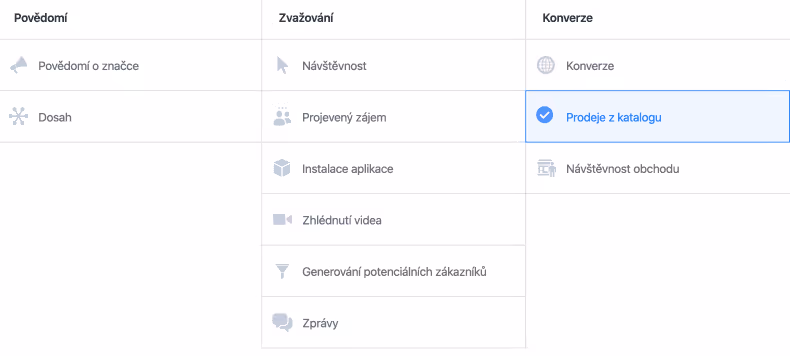Otevřete správce reklam na Facebooku (https://business.facebook.com/adsmanager) a klikněte na zelené tlačítko “Vytvořit”. Jako účel kampaně zvolte “Prodej z katalogu”.