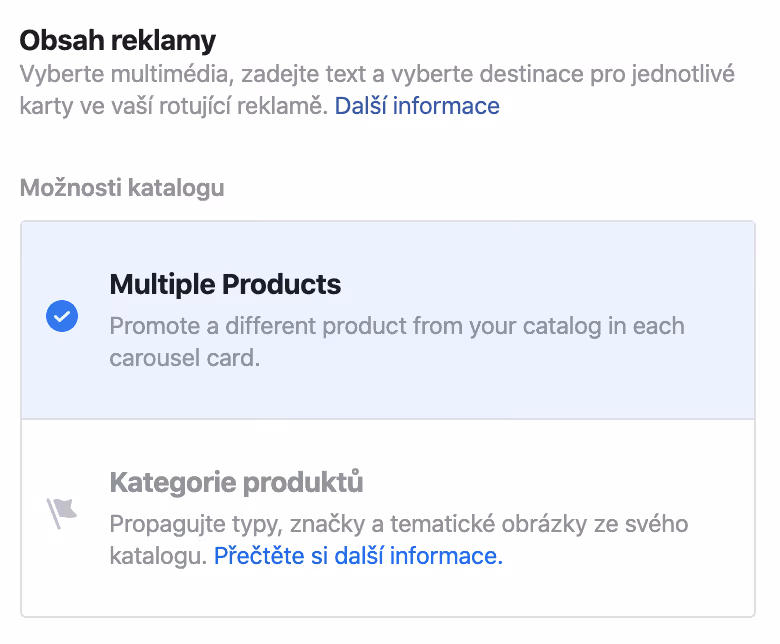 Nejvíce používaným (a většinou také nejvíce úspěšným) formátem je carousel. Určitě ale vyzkoušejte i ostatní formáty a otestujte, který vám bude přinášet nejlepší výsledky.