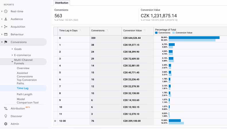 U některých e-shopů se může jednat jen o pár dní a u některých až o měsíc. Orientačně můžete délku konverzního okna zjistit v Google Analytics.