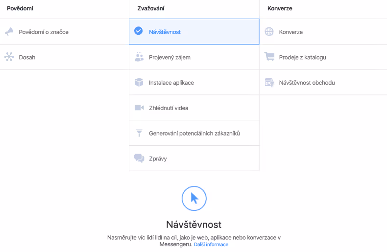 #1 – Přejděte do svého správce reklam na Facebooku a vytvořte novou kampaň. Jako účel kampaně vyberte třeba “Návštěvnost”. Remarketingový okruh uživatelů můžete použít pro všechny účely kampaní.
