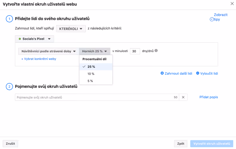 Pozor! Abyste mohli vytvářet okruhy uživatelů z návštěvníků vašeho webu, musíte mít implementovaný Facebook Pixel. Více o tom, jak Pixel vytvořit a implementovat do webu se dozvíte v našem článku o Facebook Business Manager.