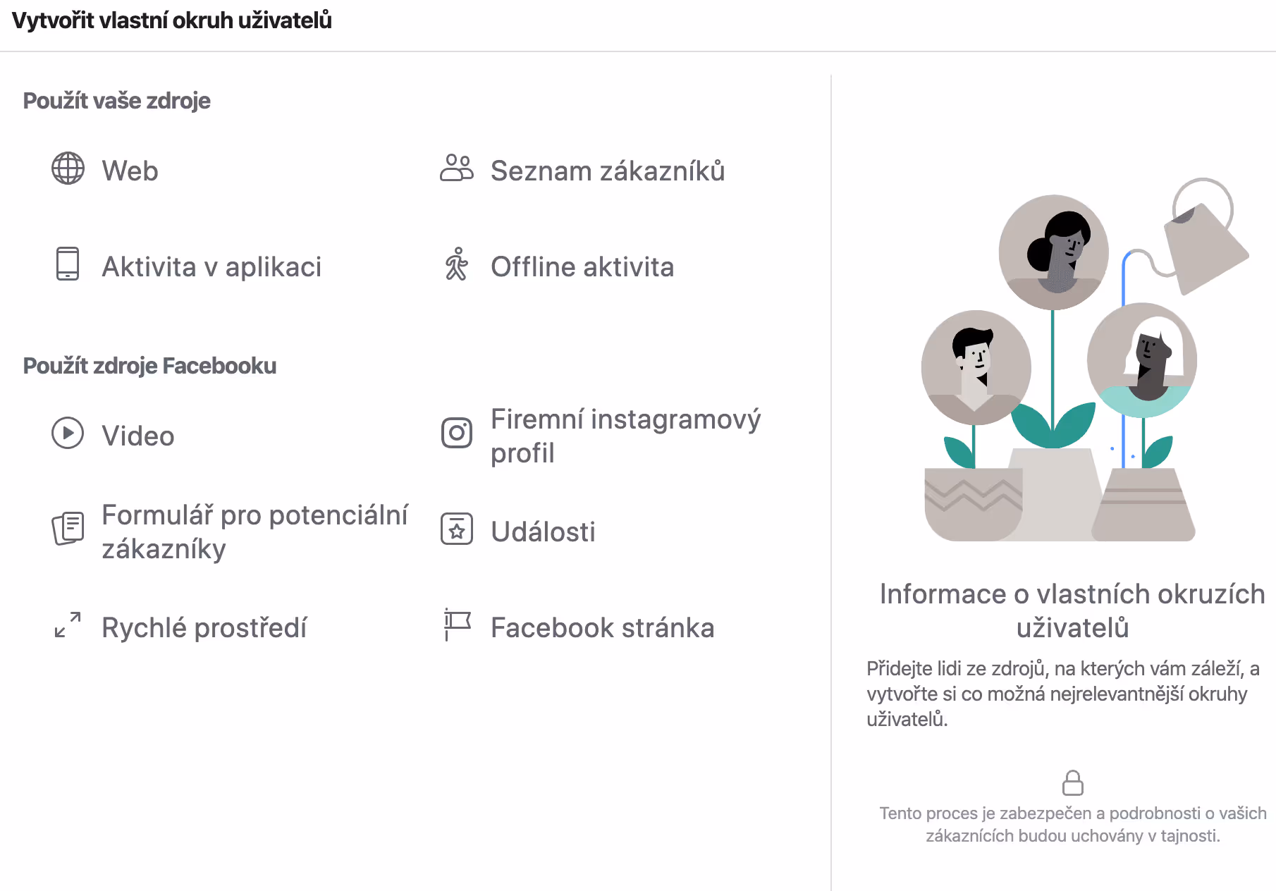 Facebook vám vždy v pravém dolním rohu ukáže, jaký zdroj dat k vytvoření daného okruhu uživatelů potřebujete.