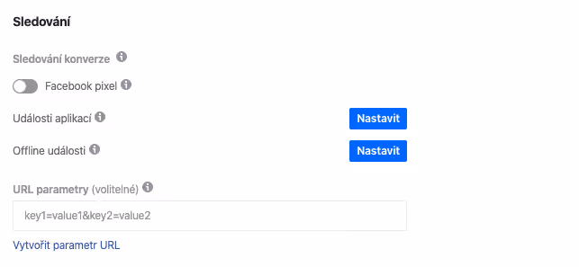 V poslední části s názvem “Sledování” nezapomeňte zapnout měření pomocí Facebook Pixelu a pokud z reklamy odkazujete na web, nezapomeňte přidat UTM parametry.