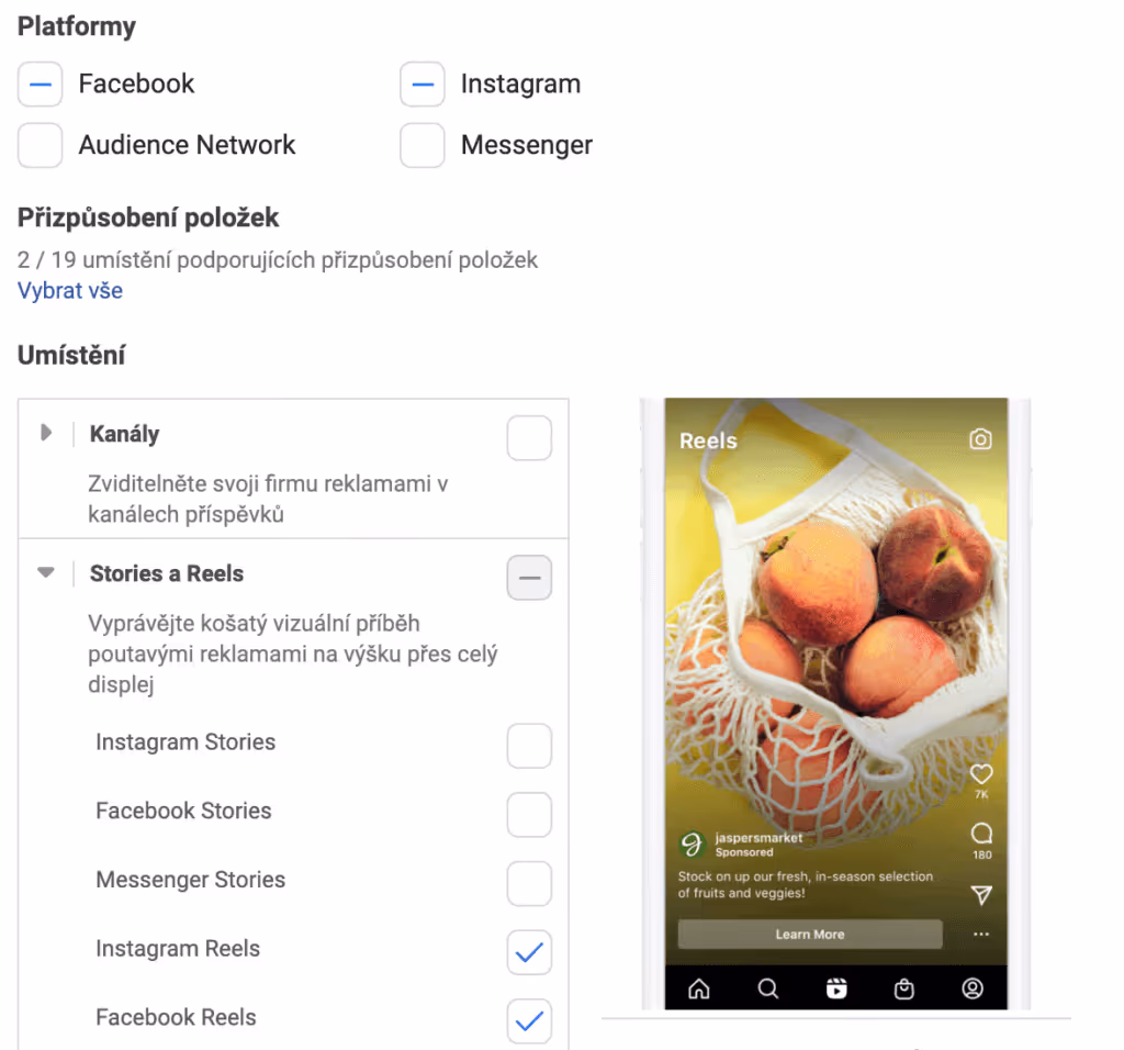 Jestli máte video připravené jen pro Reels, klikněte na “Ruční umístění” a vyberte pouze formáty Reels.