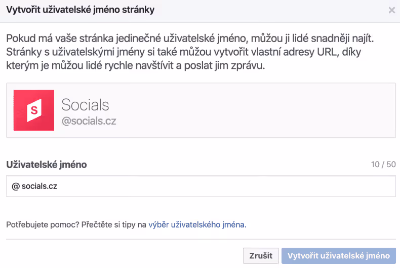 Když vytvoříte novou stránku na Facebooku, její URL adresa je něco jako facebook.com/jmeno-vasi-stranky-1234567. Abyste udělali URL adresu kratší a hezčí, musíte upravit uživatelské jméno. URL pak bude vypadat takto: facebook.com/socials.cz.
