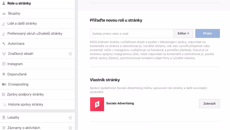 Kontrolu nad spravováním stránky si pojistíte v sekci Role. Po rozkliknutí uvidíte, kdo je majitelem stránky (to by měl být váš Business Manager), existující role a možnost přidat novou roli.