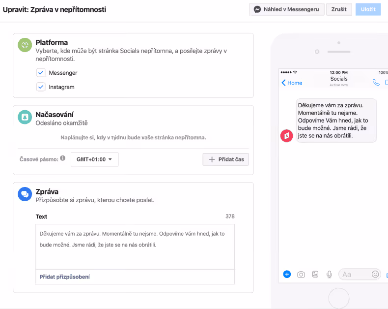 Velkou výhodou je, že pokud máte firemní profil na Instagramu spojený s vaší firemní stránkou na Facebooku, můžete si nastavit automatické odpovědi také pro Instagram direct zprávy.