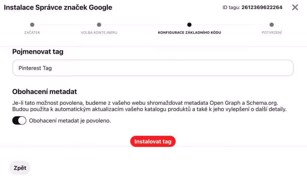 4) V konfiguraci základního kódu si Pinterest Tag vhodně pojmenujte (ideálně Pinterest Tag název eshopu) a potvrďte instalaci.
