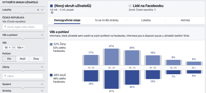 Definujte si cílovou skupinu podle zájmů a můžete zjistit, jaké stránky tito lidé lajkují, jaký je jejich průměrný věk nebo jestli se jedná více o muže nebo o ženy.