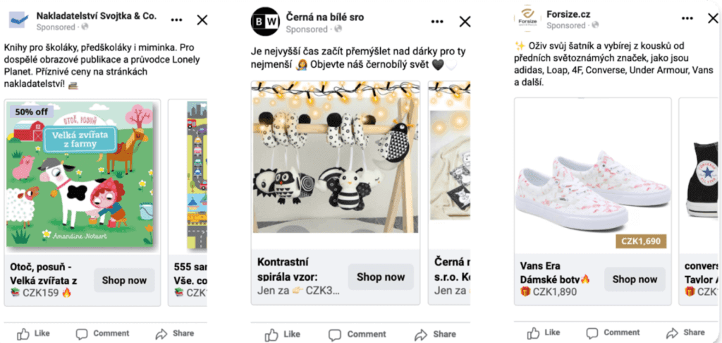 Máte na svém e-shopu alespoň 50 produktů? Rozhodně vyzkoušejte dynamické reklamy z katalogu. Pokud reklamy z katalogu neznáte, jedná se o generované reklamy produktů z XML feedu z vašeho e-shopu. Nejčastěji je na sociálních sítích vidíte ve formátu carousel s produkty na bílém pozadí.