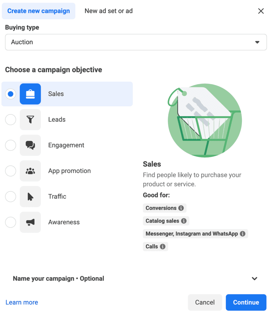 Obě kampaně nastavíte tak, že vyberete účel kampaně “Sales” a pak se rozhodnete, jestli chcete Advantage+ nebo manuální tvorbu. DABU vytvoříte manuálně.