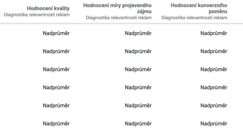 Vaším cílem je mít u všech reklam “Nadprůměr”, jako to vidíte na printscreenu ze správce reklam jednoho z našich klientů.