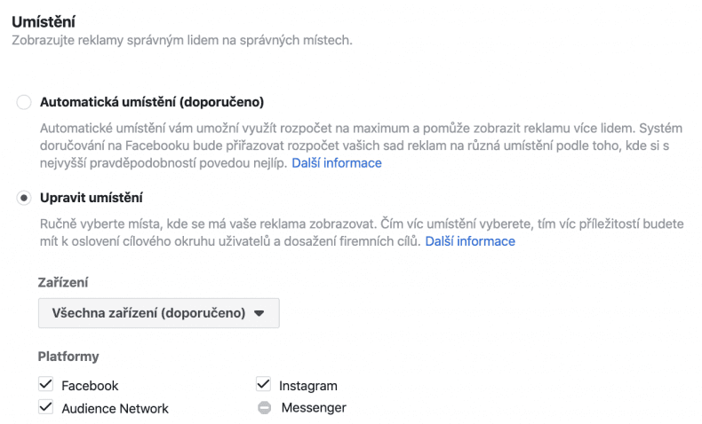 Na Facebooku, Instagramu a v audience network (partnerská síť webů a aplikací Facebooku) máte spoustu možností, kam umístit vaše reklamy.