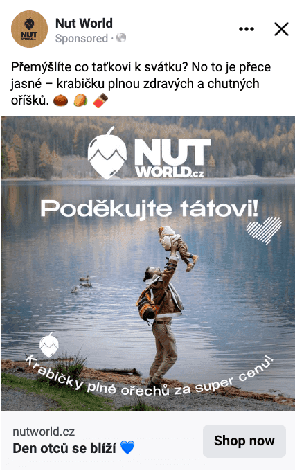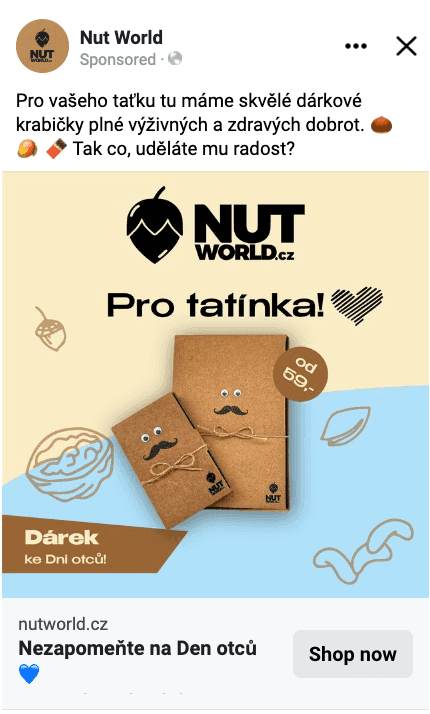S naším klientem Honzou Vlčkem (spolumajitelem e-shopu Nutworld.cz) a jeho týmem, jsme se do těchto svátků letos pořádně obuli – a to zejména na Facebooku. Vsadili jsme hlavně na Den otců a konec školního roku a výsledky byly více než uspokojivé: