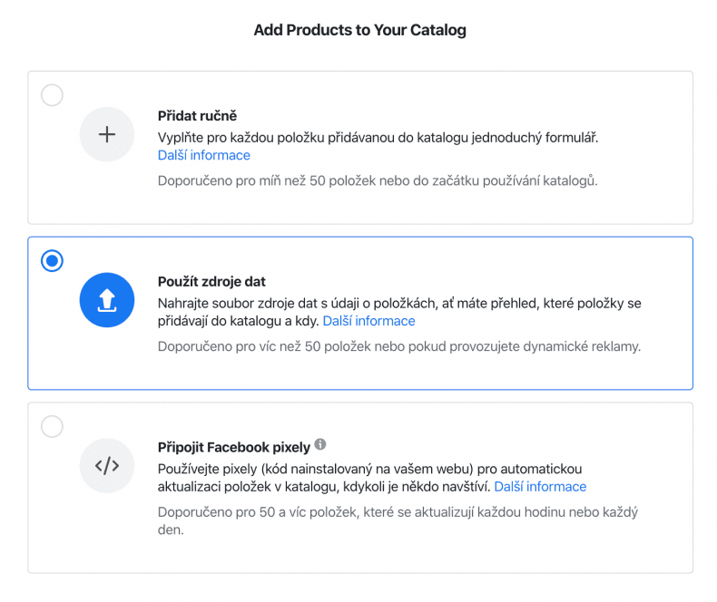 #2 – V tomto kroku vyberete, jakým způsobem chcete produkty přidat. Vyberte “Použít zdroje dat” a klikněte na pokračovat.