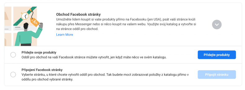 Propojte firemní stránku na Facebooku s katalogem produktů pro možnost používání obchodu na Facebooku a označování produktů v příspěvcích. Přejděte do “Použít případy”, vyberte “Obchod stránky na Facebooku” a přidejte firemní stránku.