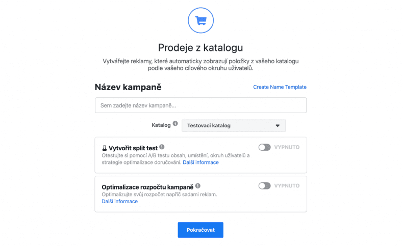 Ve spodní části stránky pojmenujte kampaň a vyberte katalog produktů, který jste do Facebooku nahráli. Také si můžete vybrat, zda chcete optimalizovat rozpočet kampaně na úrovní reklamních sestav nebo celé kampaně. Následně klikněte na “Pokračovat”.