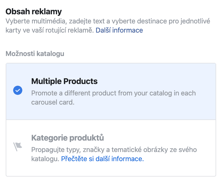 Můžete si vybrat, jestli chcete propagovat celé kategorie, nebo jednotlivé produkty. Pro klasický produktový dynamický remarketing použijte první možnost.