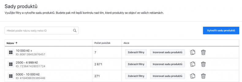 Katalog máte vybraný a nyní je třeba specifikovat produkty, které chcete propagovat. Určitě zvažte rozdělení produktů podle kategorií a podle hodnoty. Je pravděpodobné, že nebudete chtít remarketovat všechny produkty, protože na nich máte nízkou marži. V takovém případě si připravte sadu produktů dražších než třeba 300 Kč.