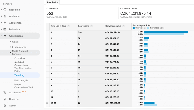 U některých e-shopů se může jednat jen o pár dní a u některých až o měsíc. Orientačně můžete délku konverzního okna zjistit v Google Analytics.