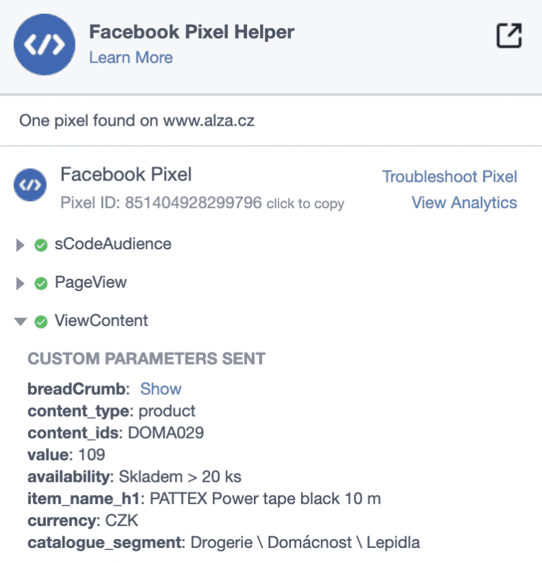 Až budete mít produkty importované do Facebooku, ujistěte se, že se správně párují s událostmi z Pixelu. Zjistíte to tak, že na svém e-shopu otevřete libovolný produkt a kliknete na ikonku Facebook Pixel Helperu ve vašem prohlížeči