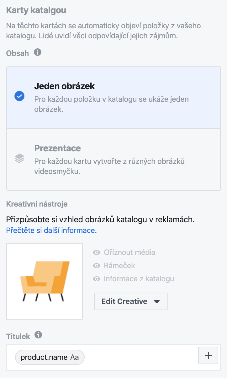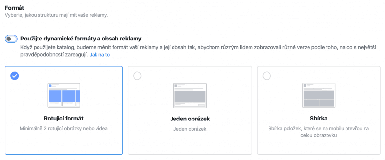 Alternativou je použít dynamický formát reklamy, kdy si Facebook formát určuje sám a upřednostňuje ten, který má nejlepší výsledky.