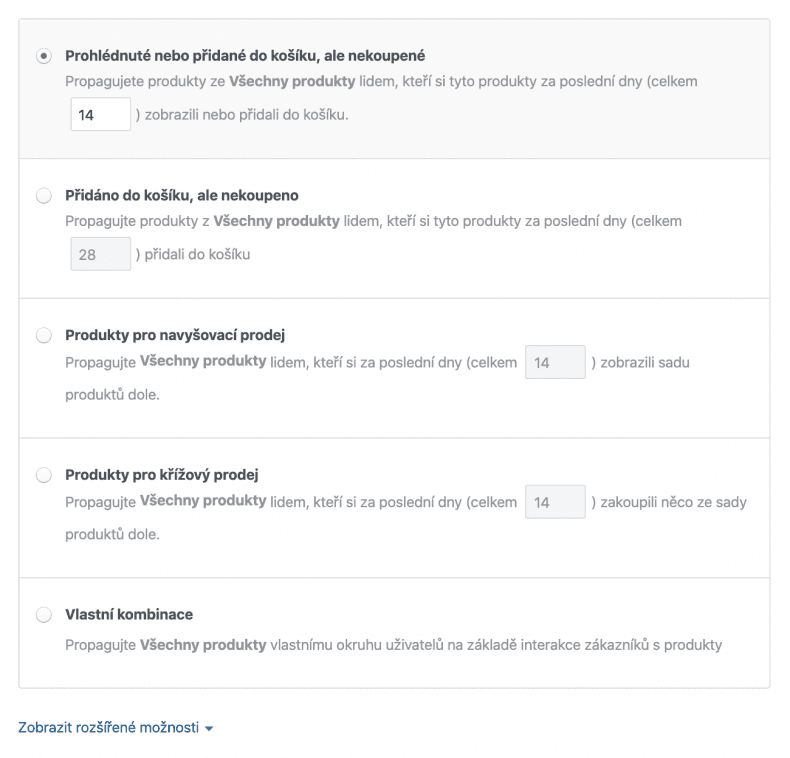Při remarketingu máte několik možností jak reklamy zacílit. S velkou pravděpodobností budete nejspíš používat první možnost “Prohlédnuté nebo přidané do košíku”, kdy remarketujete všechny, kteří si prohlédli nebo přidali produkt do košíku.