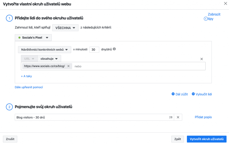 #4 – Poďme si pro ukázku vytvořit okruh uživatelů, kteří v posledních 30 dnech navštívili náš blog. Jak vidíte, vybrali jsme návštěvníky konkrétních webů a do kolonky níže vložili URL adresu našeho blogu.