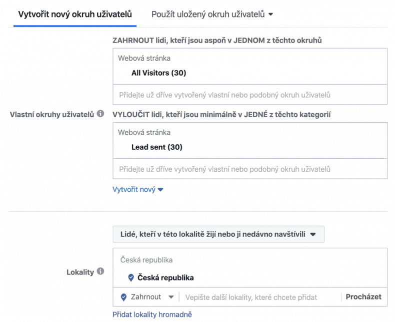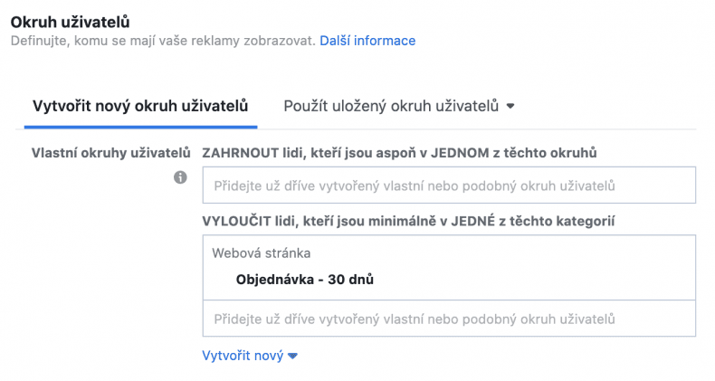 Pak už stačí jen vyloučit tento okruh uživatelů při tvorbě reklamní sestavy ve správci reklam na Facebooku.