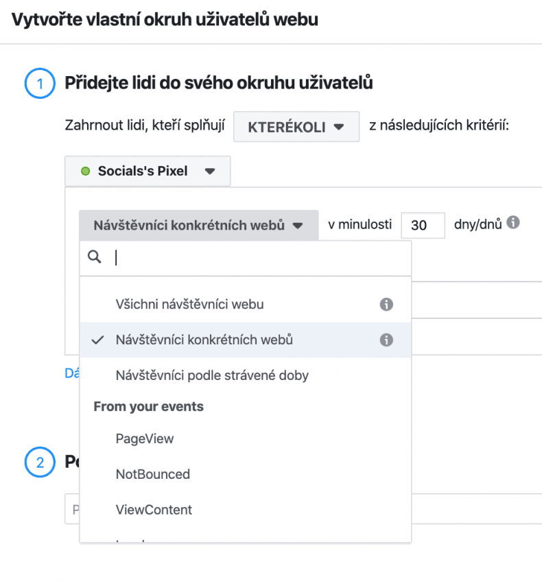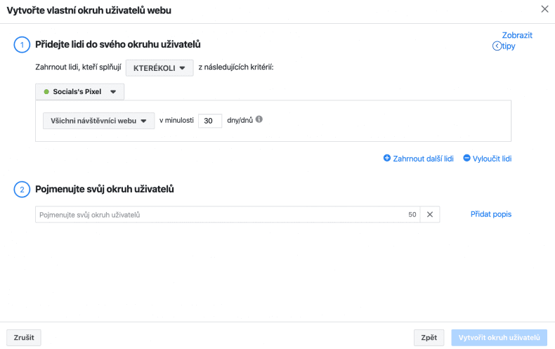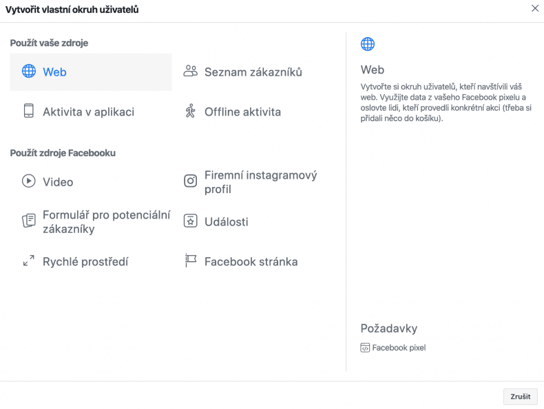 Pozor! Abyste mohli vytvářet okruhy uživatelů z návštěvníků vašeho webu, musíte mít implementovaný Facebook Pixel. Více o tom, jak Pixel vytvořit a implementovat do webu se dozvíte v našem článku o Facebook Business Manager.