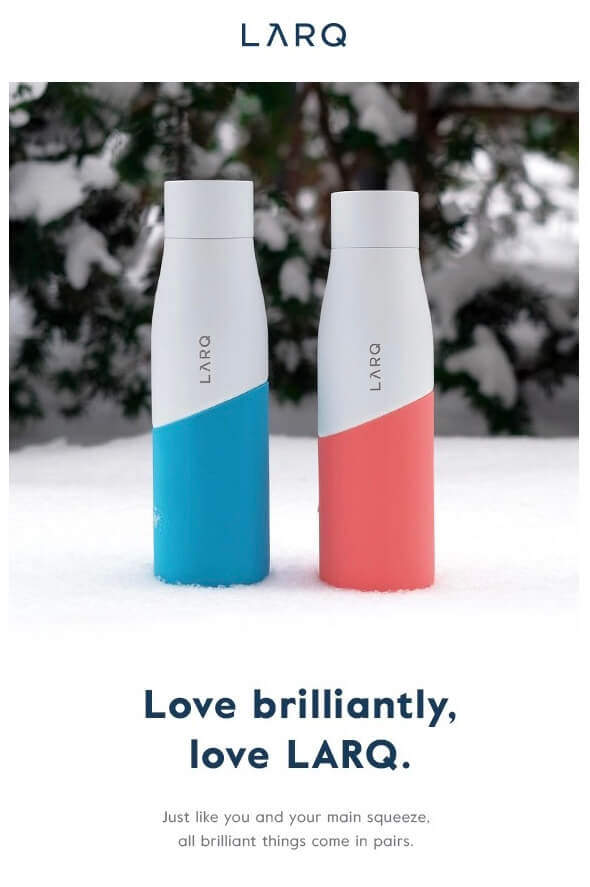 Značka LARQ provozuje e-shop, který prodává láhve na vodu. A láhev na vodu rozhodně není něco, co by byl úplně tradiční valentýnský předmět. Ale markeťáci v LARQ vzali Valentýna po svém a dokázali z něj vytěžit maximum. Udělali speciální nabídku 2 kusů láhví za zvýhodněnou cenu a odprezentovali to jako láhve pro páry. Jednoduché, originální a účelné!