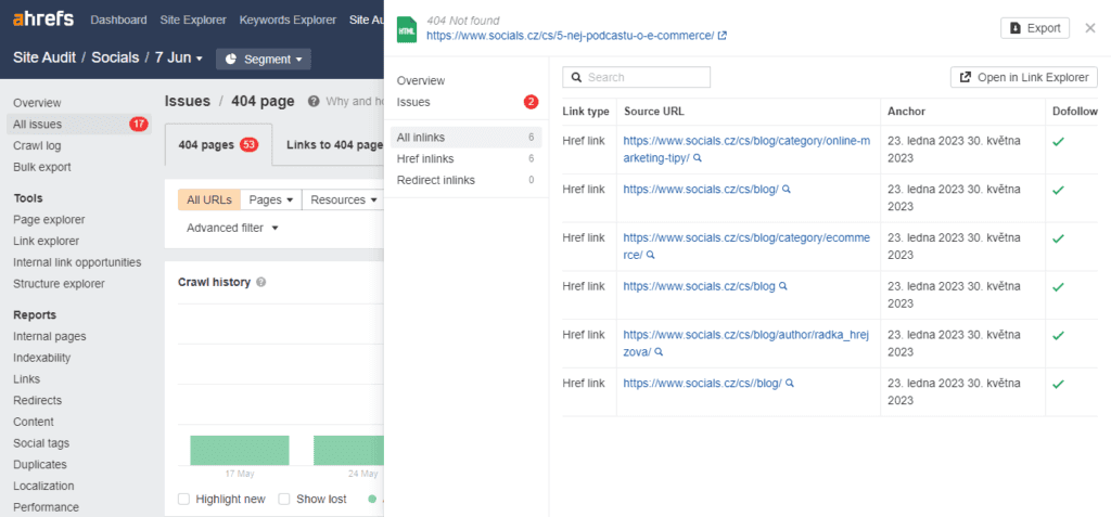 Funkčnost odkazů za vás může automaticky kontrolovat také nástroj Ahrefs Webmaster Tools, který vám bude v nastavených intervalech (doporučujeme 1 × za týden) posílat shrnutí z analýzy procházení vašeho webu. Najdete v něm také přehled nových i starších nefunkčních odkazů.