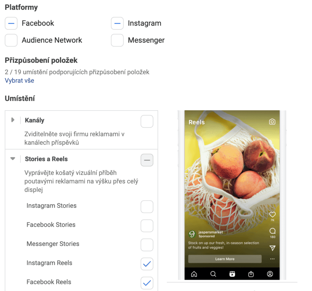 Jestli máte video připravené jen pro Reels, klikněte na “Ruční umístění” a vyberte pouze formáty Reels.