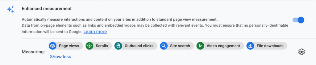Pokud jste se alespoň základně vyznali v Google Tag Manager, tak jste si pravděpodobně posílali do UA eventy jak scroll, outbound clicks, video engagement či stažení souboru. V rámci GA4 se tyto eventy měří automaticky. Stačí pouze měření zapnout v nastavení Data Streamu.