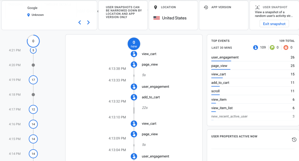 Velkou výhodou Event-based modelu je fakt, že můžete na základě kliknutí, scrollů a dalších interakcí získat lepší obrázek o tom, jak se uživatelé na webu nebo v aplikaci chovají. Vytvoříte si takovou timeline chování návštěvníků na základě všech eventů, které jsou do GA4 odesílané.