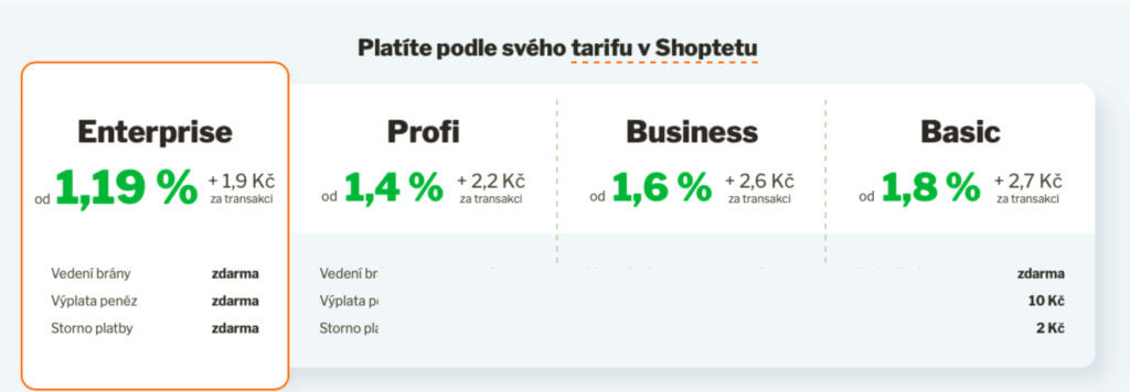 Ceny se odvíjejí podle vašeho tarifu na Shoptetu. Čím "vyšší" tarif, tím samozřejmě platíte za platební bránu méně. Přesvědčte se sami: