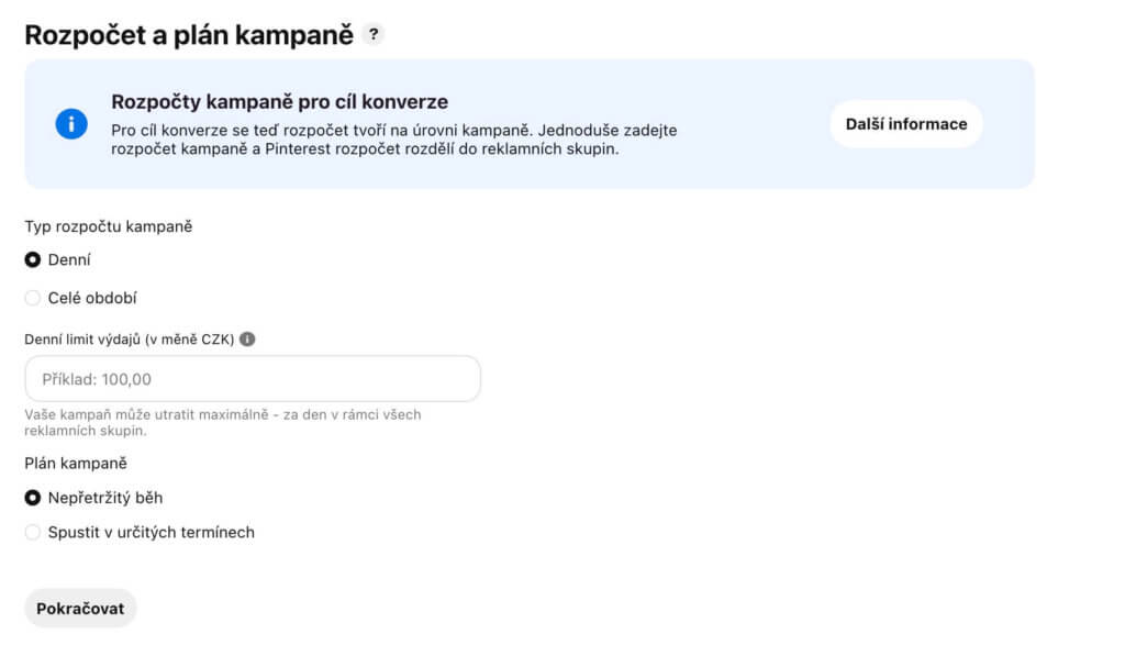 👉🏻 Pokud začínáte, zvolte si klidně menší rozpočet 50 až 100 Kč denně. Postupem času můžete rozpočet flexibilně upravovat podle dosažených výsledků.