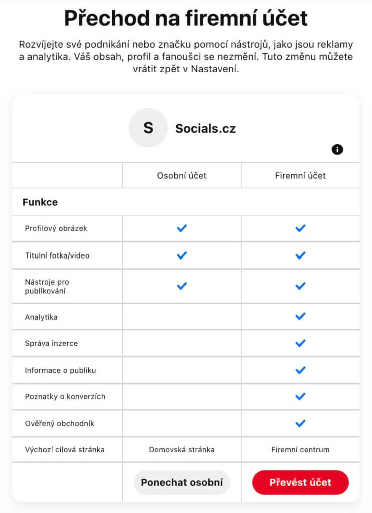 2) Z osobního profilu nemůžete vytvářet sponzorované reklamy, proto musíte přejít na firemní profil. To uděláte tak, že si v pravém horním rohu rozbalíte roletku pomocí šipečky 🔽 a zvolíte možnost ,,Přejít na firemní". V dalším kroku vám Pinterest nabídne souhrn toho, co přechod na firemní profil nabízí a potom klikněte na červené tlačítko ,,Převést účet".
