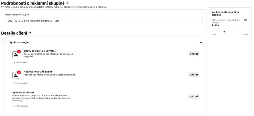 Nyní se nacházíte v reklamní sadě, nebo-li v sekci podrobností o reklamní skupině. Jednoduše řečeno si zde vyspecifikujete konkrétní cílovou skupinu, na kterou budete cílit jednu či více reklam. Vpravo se vám zobrazuje ,,Velikost potenciálního publika", což je odhad Pinterestu, kolik je v rámci vámi zvoleného okruhu aktivních měsíčních uživatelů.