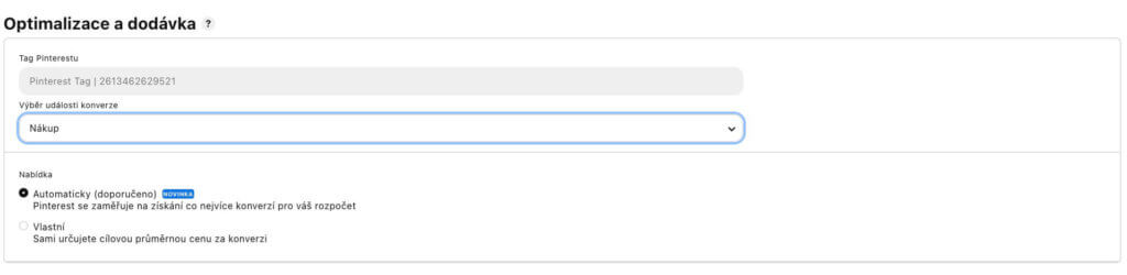 V tomto kroku si vyberte na co chcete optimalizovat svou reklamu. Na výběr budete mít z nastavených konverzních událostí. Určitě bychom doporučili začít s optimalizací na nákupy a automatickým doručováním.