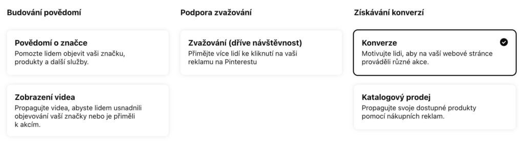 Kampaň za účelem získání konverzí využijete v případě, že chcete přímo prodávat produkty nebo například sbírat leady. Před spuštěním kampaně si ale musíte nastavit Pinterest Tag a konverzní události.