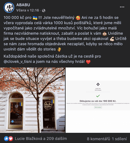 Náš klient, e-shop s dětskými hračkami a látkami s předtištěným střihem, vybral krásných 100 000 Kč, a to za pouhých 5 hodin! Peníze byly získány prodejem celkem 1000 kusů polštářků. A díky úspěchu této bleskové akce se Ababu snaží vymyslet jiné možnosti, jak rychle vyrobit nějaký další produkt pro stejné účely. 👏🏼