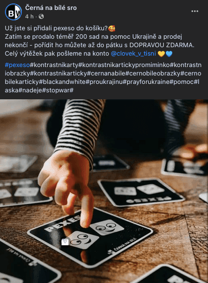 E-shop s oblíbenými kontrastními kartičkami vybral jeden z oblíbených produktů, ze kterého jde 100 % výtěžku z prodeje na pomoc Ukrajině. Akci nechávají běžet celý jeden týden a navíc přihodili i dopravu zdarma, aby tuto akci podpořili. 👏🏼