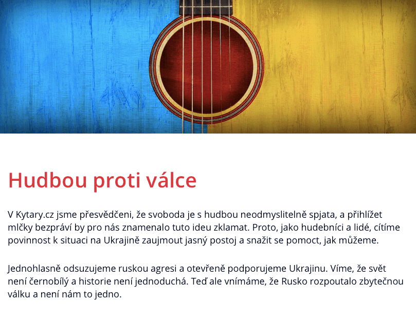 Spousty e-shopů nabízí zboží původem z Ruska, a to i e-shop s hudebními nástroji Kytary.cz. Tedy alespoň donedávna nabízel. To se změnilo s počátkem války na Ukrajině, kdy Kytary.cz kompletně odřízly ruské dodavatele, na demonstraci protestu proti ruské invazi. A navíc umístili na své webovky a sociální sítě odkaz na sbírku Člověka v tísni, kterého tím podporují. 👏🏼