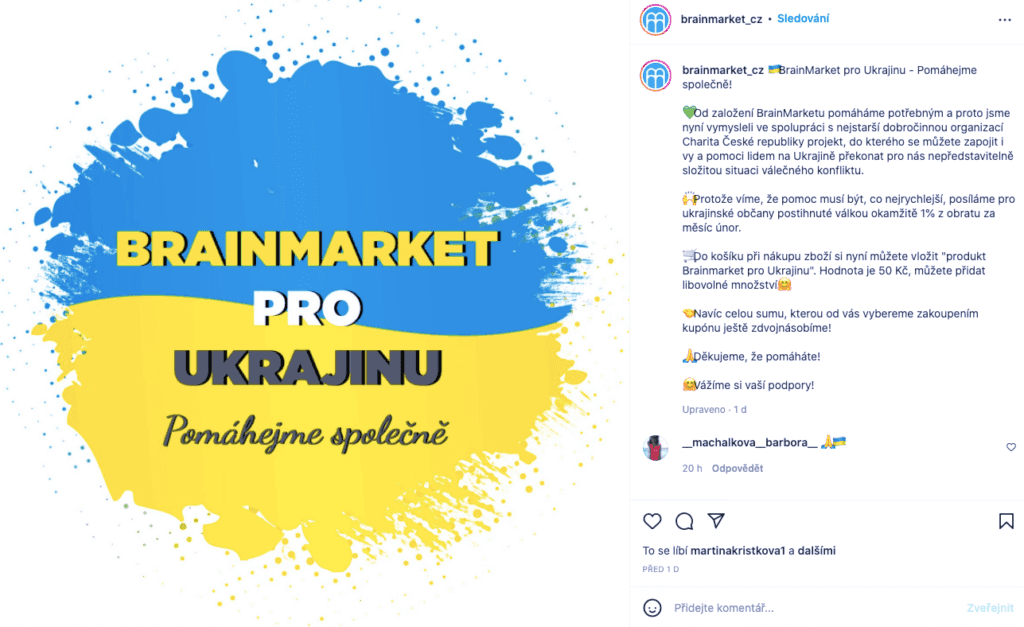 Na pomoc Ukrajině se vrhl i “první GameChanger e-shop ve zdravém životním stylu”, společně s nejstarší dobročinnou organizací Charita České republiky. Brainmarket.cz okamžitě poslal pro ukrajinské občany postihnuté válkou 1 % z obratu za měsíc únor. A navíc vytvořil produkt “Brainmarket pro Ukrajinu”, což je jednoduše voucher v hodnotě 50 Kč, ke kterému Braimarket přihodí sám dalších 50 Kč ze svého a finální vybraná částka poputuje na konto Charity České republiky.